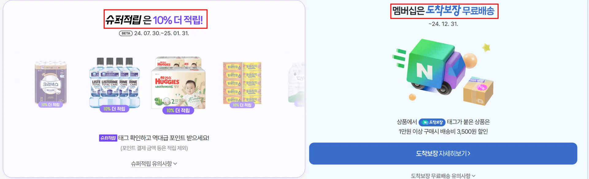 이외에도 [슈퍼적립] 태그가 붙은 상품 구매 시 추가 10%가 더 적립되고,(~25/1/31) [도착보장] 태그가 붙은 상품을 구매하면 배송비 3,500원 할인 쿠폰을 받을 수 있어요.(~24/12/31)