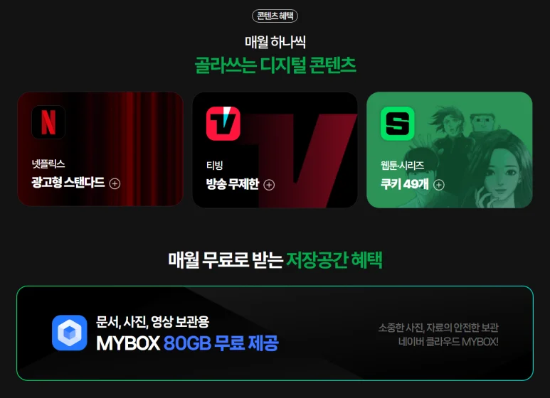 여기에 더해, 네이버의 파일 드라이브인 MYBOX 80gb도 매월 무료로 제공돼요.