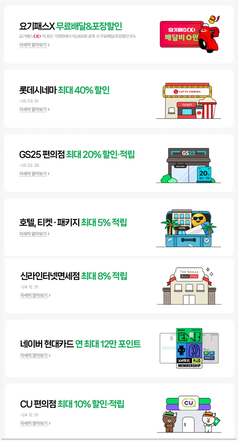 대표적으로는 [요기패스 무료배달&포장할인 5%, 롯데시네마 최대 40% 할인, CU/GS25 편의점 각 10%/20% 할인·적립, 신라인터넷면세점 최대 8% 적립] 등의 혜택을 제공해요.
