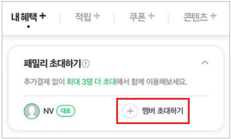 네이버플러스 멤버십은 ‘패밀리 초대하기’ 기능이 있어서 최대 3명의 패밀리 멤버를 초대해 하나의 네이버멤버십 구독으로 4명이서 함께 네이버멤버십 혜택을 공유할 수 있어요.