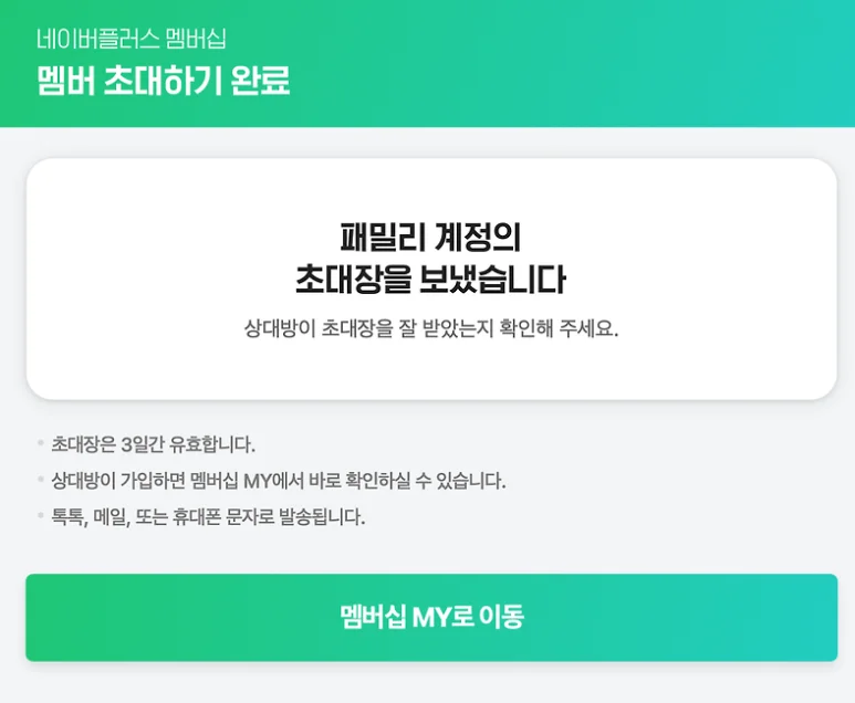 2. 네이버 톡톡 / 메일 / 문자 등으로 패밀리 멤버에게 초대장 발송 > 3일 이내에 초대장 수락하고 이용 약관 동의 시 추가 결제 없이 네이버멤버십 이용 가능
