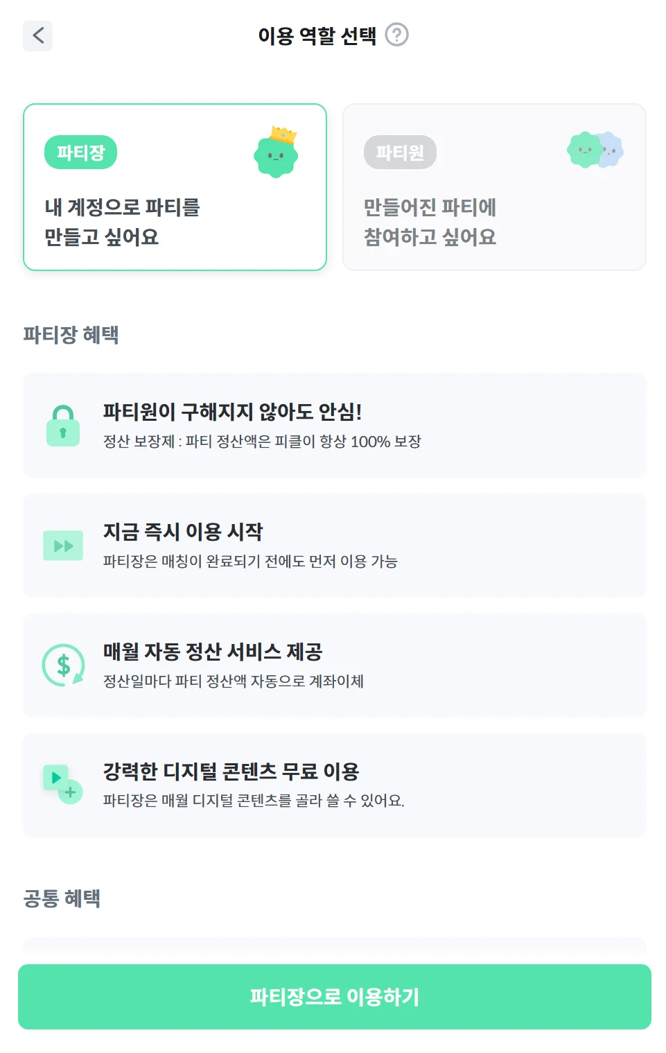 • 파티장은 파티원 매칭 여부와 상관없이 파티 생성한 날부터 계산해, 매월 파티 생성일마다 정산금을 받을 수 있어요.(정산 보장제)