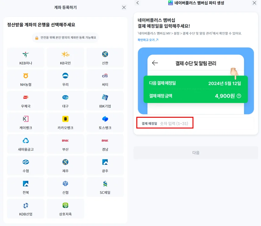 4. 파티장은 정산받을 계좌 정보와, 네이버플러스 멤버십 결제 예정일을 입력해요.