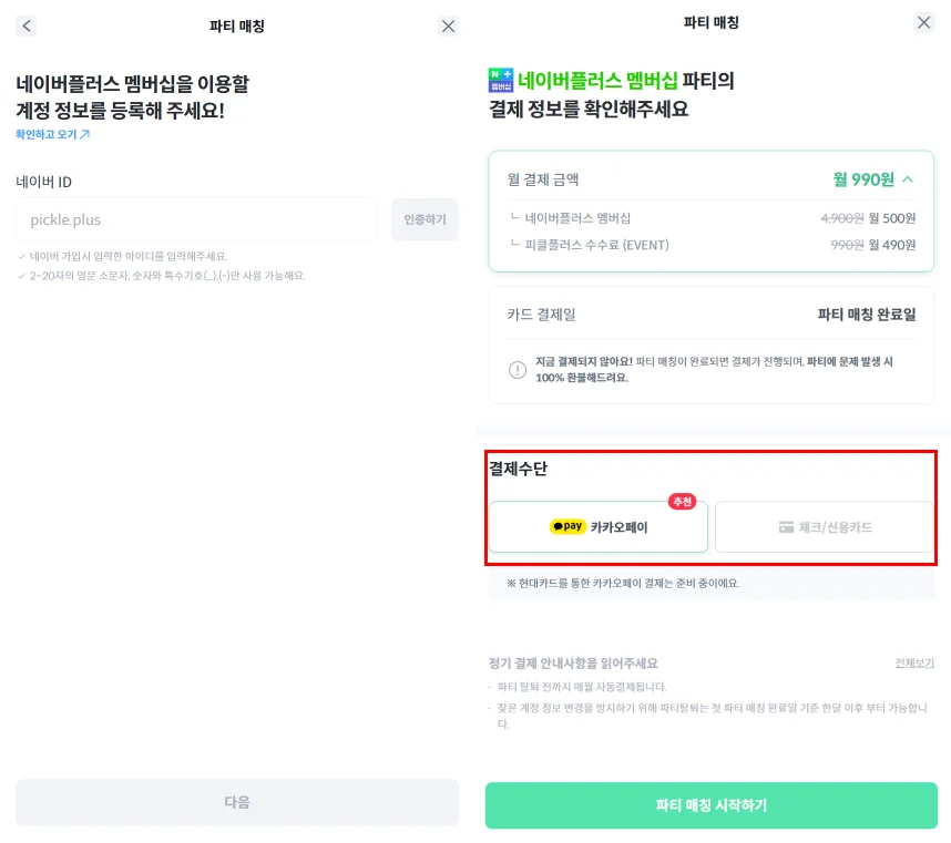 5. 파티원은 네이버멤버십 계정 정보를 인증하고, 매달 네이버플러스 멤버십 이용료를 결제할 결제 수단을 등록해요.