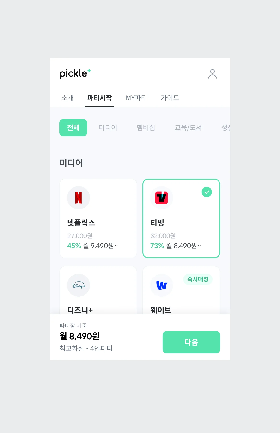 공동 구독 플랫폼 피클플러스를 통해 티빙 프리미엄 요금제를 51% 할인된 월 8,490원에 이용할 수 있어요.