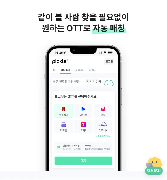 신속한 파티 매칭부터 알아서 척척 같이 공유할 유저를 찾아주니까, 지인이나 가족 없이도 편리하게 OTT 파티를 맺을 수 있어요.