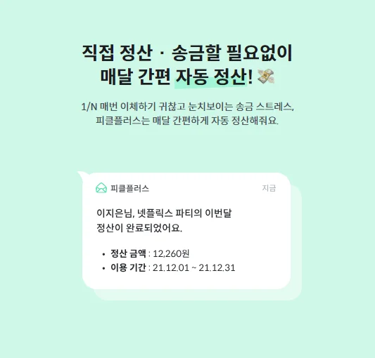 피클플러스에서 파티원으로부터 매달 간편하게 자동 정산을 진행해 주는데요, 혹시나 파티원이 모집 되지 않아도 피클플러스에서 직접 정산금을 보장해주기 때문에 믿고 이용할 수 있어요.