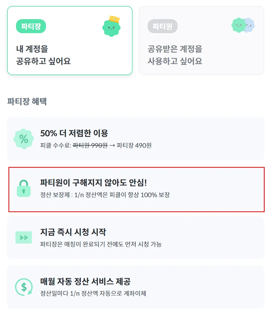 또, 가장 좋은 점은 파티원이 빠르게 매칭되지 않아도 파티 만든 날부터 정산금을 피클플러스에서 대신 내주는 ‘파티장 정산보장제’와, 파티원의 경우 파티 생성 한 달 뒤부터는 언제든 중도 해지+남은 기간 환불이 가능하다는 거예요👍