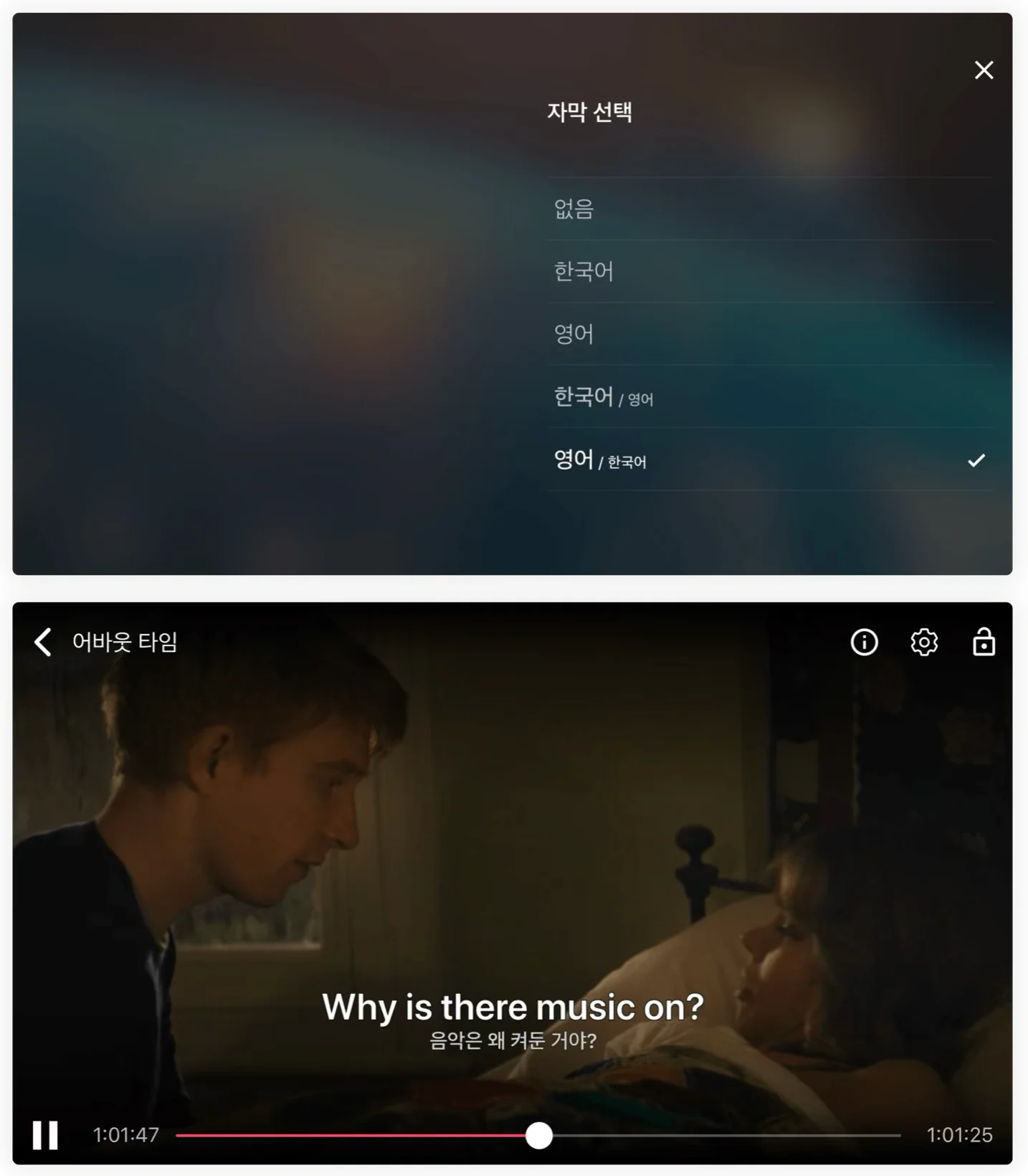 한글 자막 지원은 다른 OTT에 비해 왓챠가 다소 약할 수 있지만, 대신 왓챠만의 포인트! 한국어와 영어를 함께 볼 수 있는 다중 자막 서비스가 지원된다는 사실🫢!!
