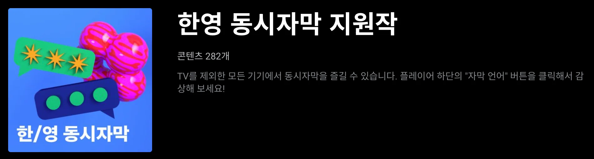 특히, 한영 동시 자막 지원은 24년 영어 공부를 결심하셨다면 이보다 유용할 수 없는 기능인 만큼 꼭 이용해보길 권해드려요. (왓챠 한영 동시자막 지원작 보러 가기 👉 링크)