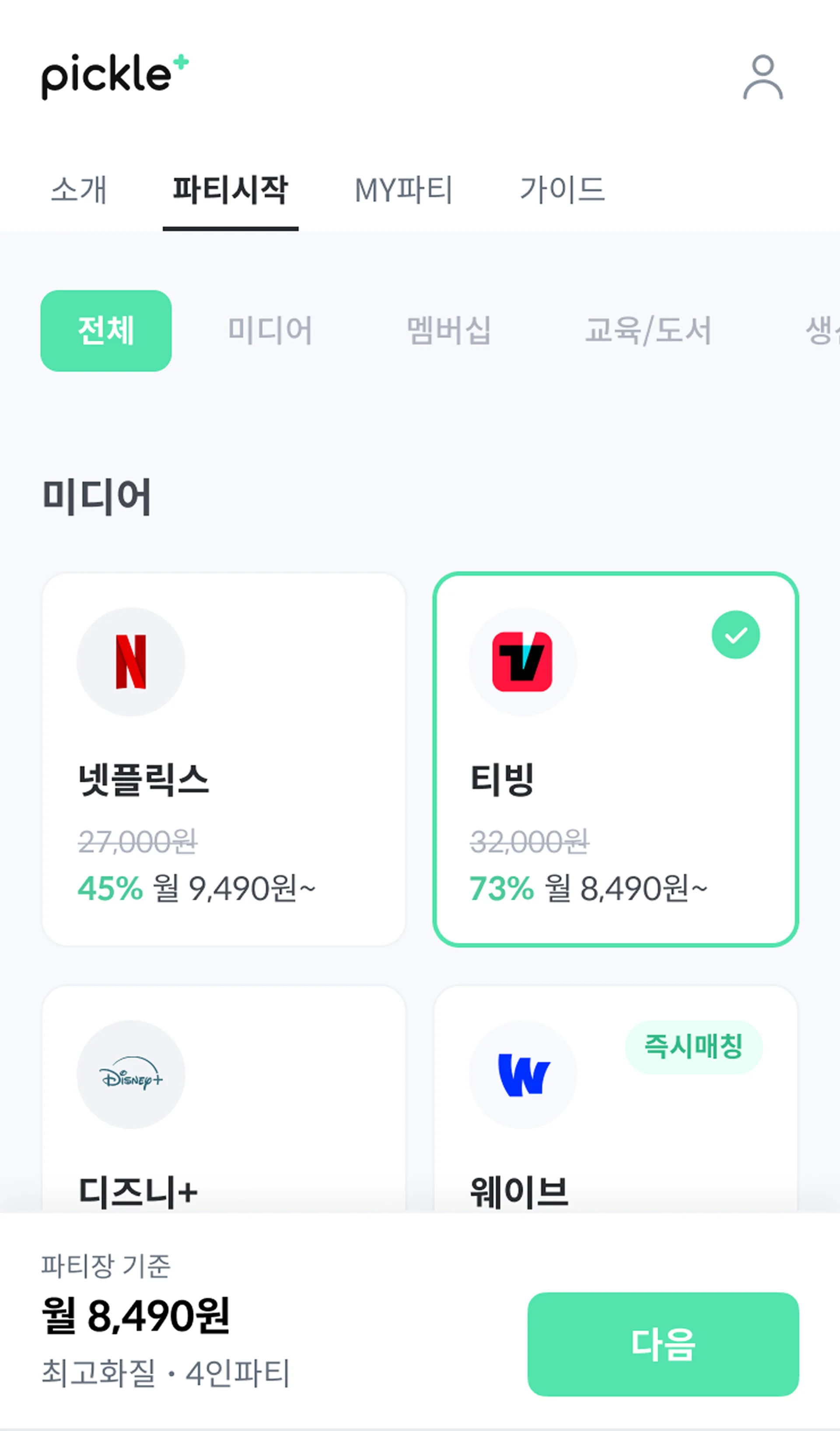 예를 들어 티빙 프리미엄 요금제는 월 17,000원인데요, “피클플러스”에 여러분의 티빙 프리미엄 멤버십을 공유하면 티빙 4인 파티 기준으로 각자 월 4,250원에 티빙 프리미엄을 이용할 수 있죠.