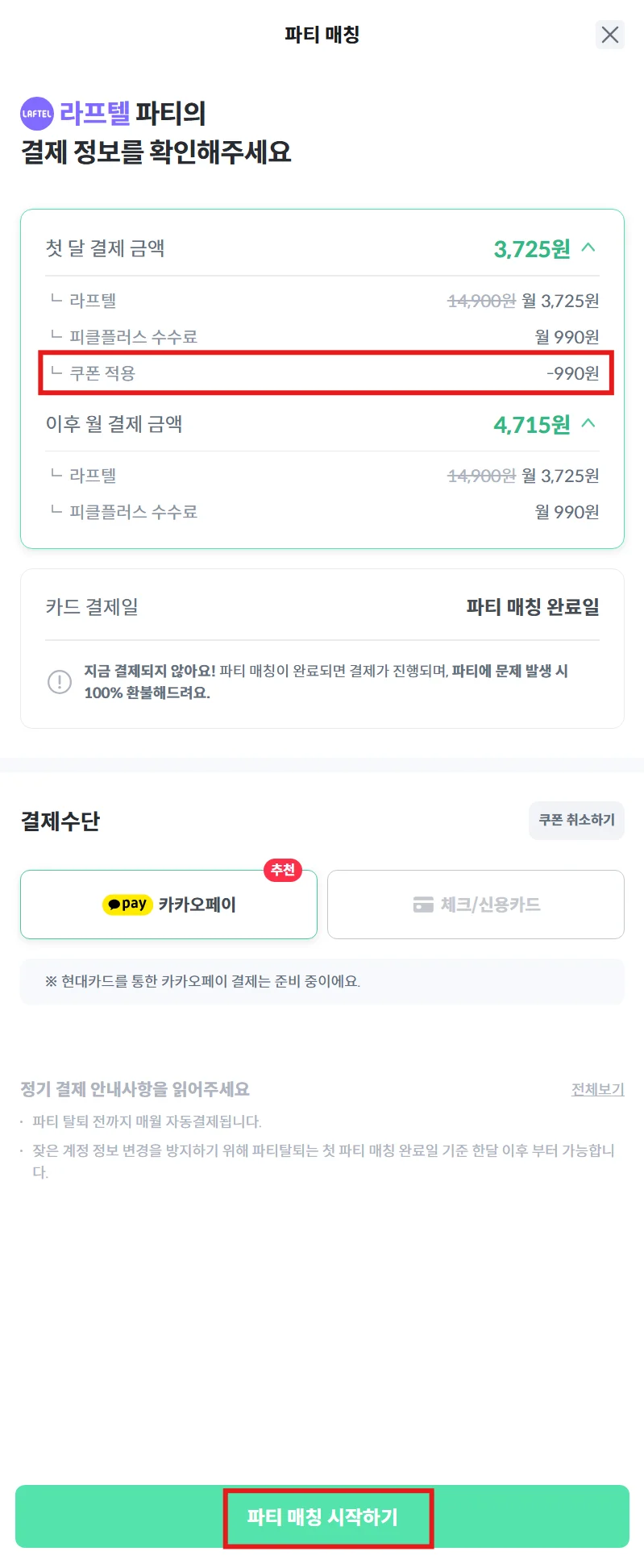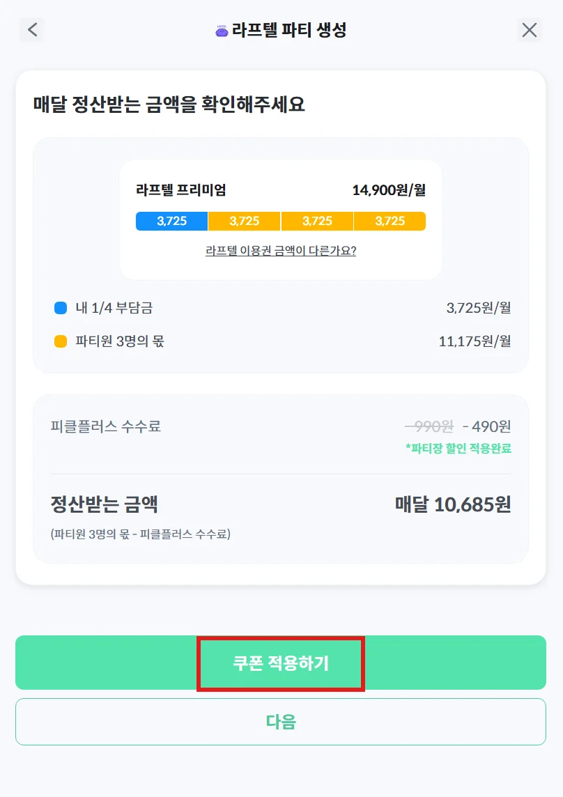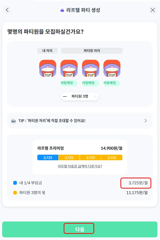 첫 달은 수수료 없이 라프텔 월 이용료를 4로 나눈 1인 부담금 3,725원이 결제되고, 다음 달부터는 파티원 수수료 990원을 더한 4,715원이 결제돼요.