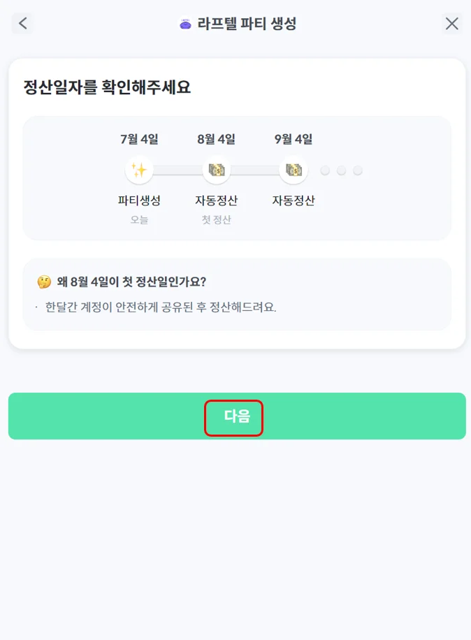 7. 정산 일자를 확인해 주세요. 파티 생성 한 달 뒤부터 자동 정산이 이뤄져요.