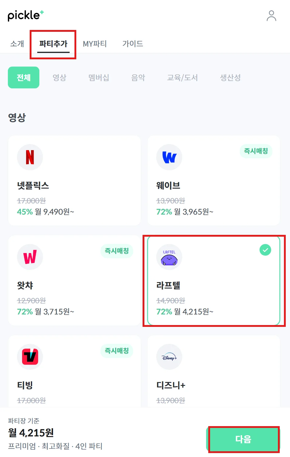 ​총 4명의 파티원을 모아 라프텔 계정을 공유한다면, 월 14,900원인 라프텔을 월 4,215원에 이용할 수 있어요!