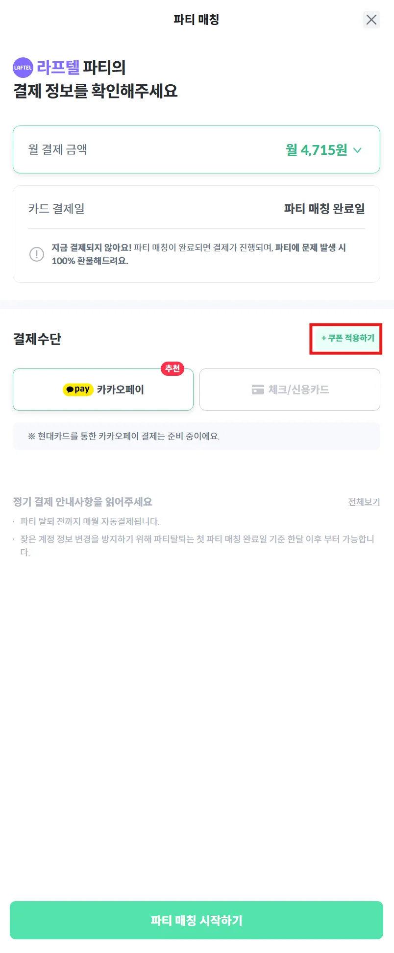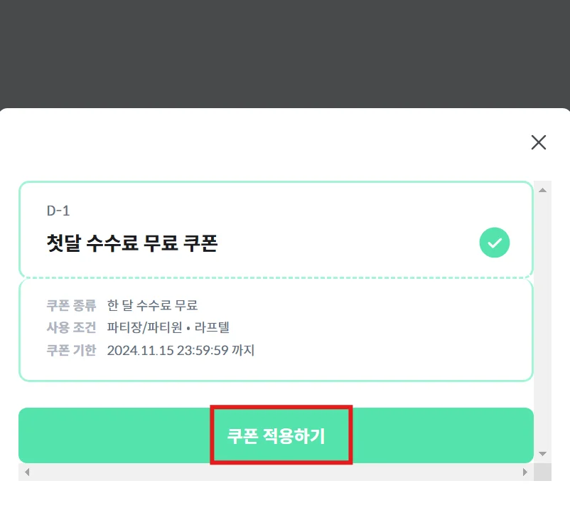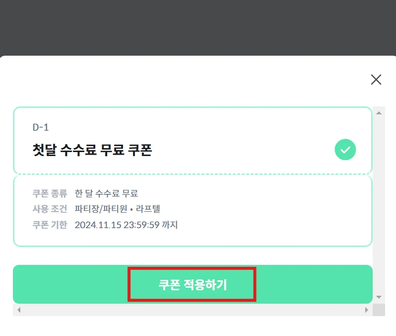 등록 후 24시간 안에, 파티장은 파티를 생성하고, 파티원은 '결제수단 등록' 단계에서 쿠폰을 적용해야 해요.