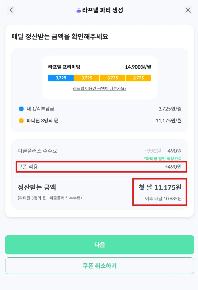 첫 달은 라프텔 1/4 분담금 3,725원에 3을 곱한 11,175원을 정산 받고, 다음 달부터는 파티장 수수료 490원을 차감한 10,685원을 정산 받아요.
