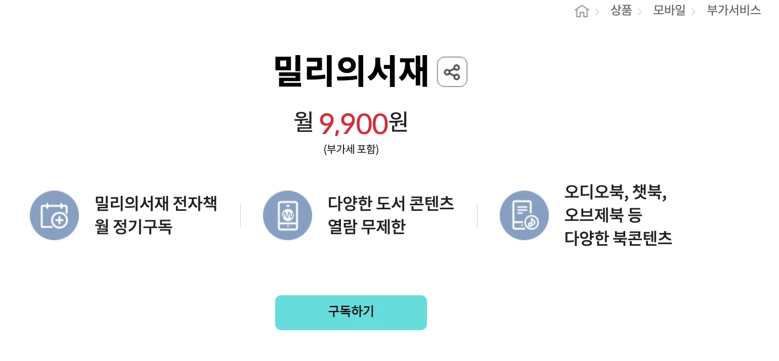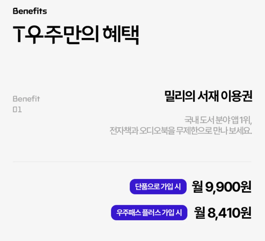 • SKT: 'T 우주패스' 패키지에 밀리의서재를 추가하여 다른 서비스와 묶음 할인을 받을 수 있습니다.
