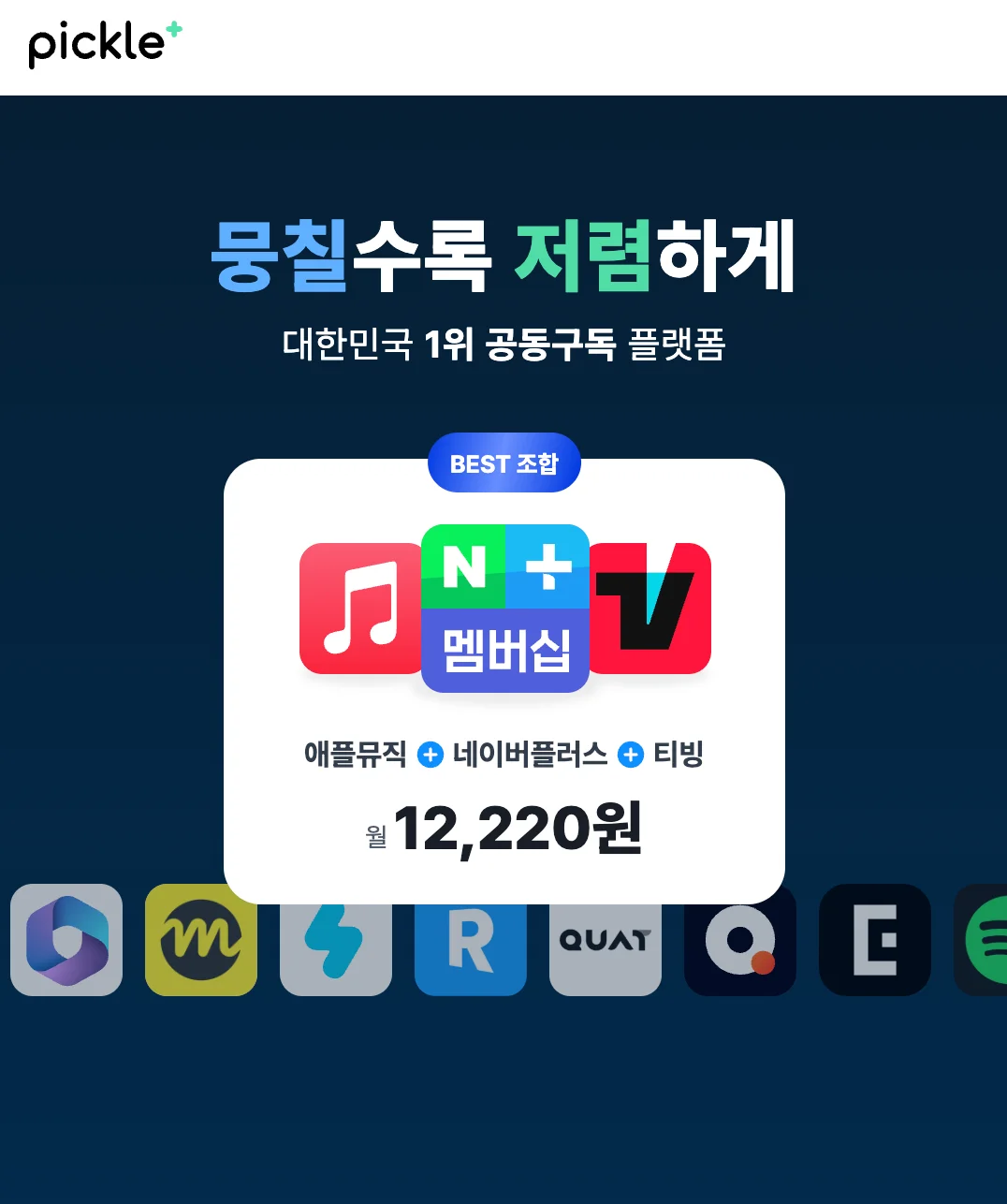 피클플러스는 대한민국 1위 공동구독 플랫폼으로서 다양한 구독 서비스를 저렴하게, 그리고 편리하게 구독을 매칭해주고 자동으로 정산하여 해결해주고 있습니다.