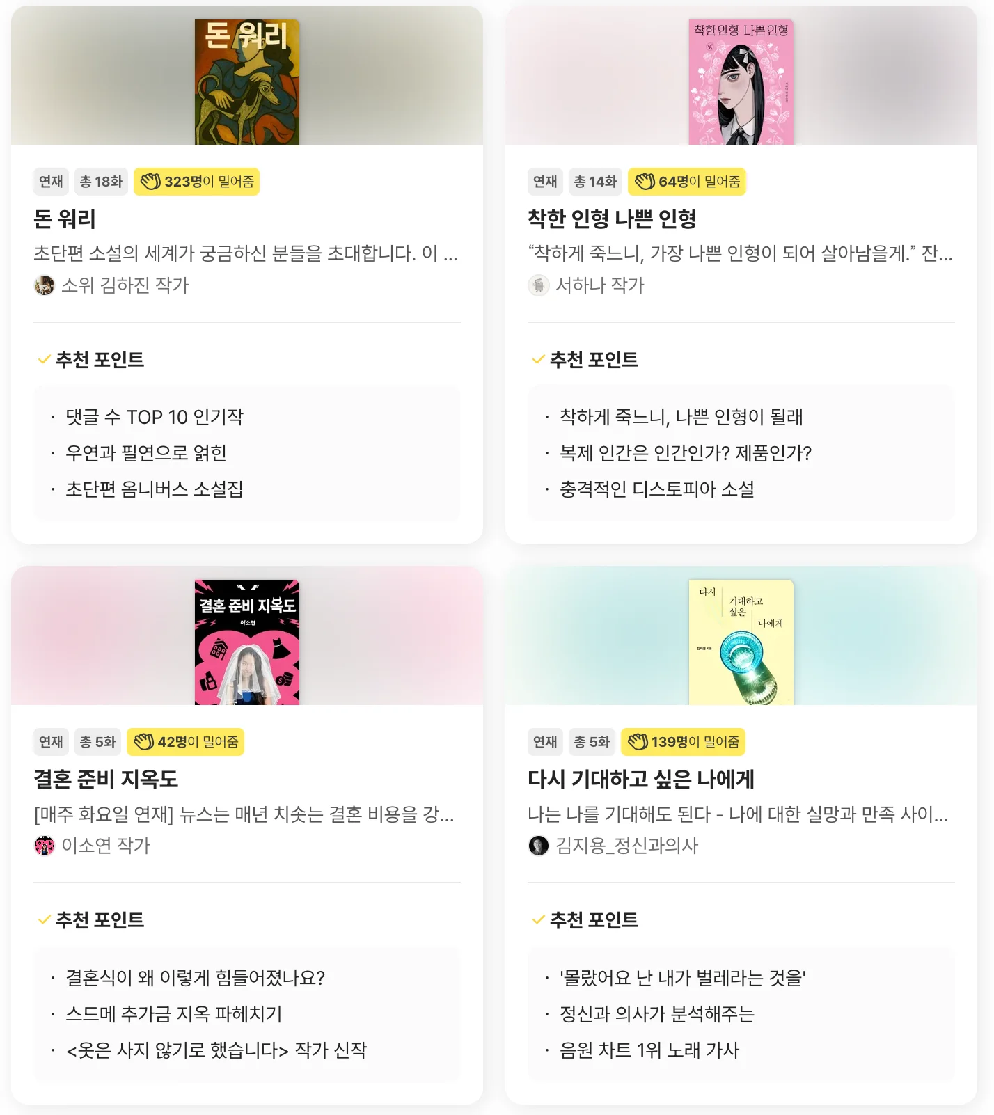 작가를 밀어줄 수 있는 기능과 댓글을 통하여 소통 할 수 있습니다.