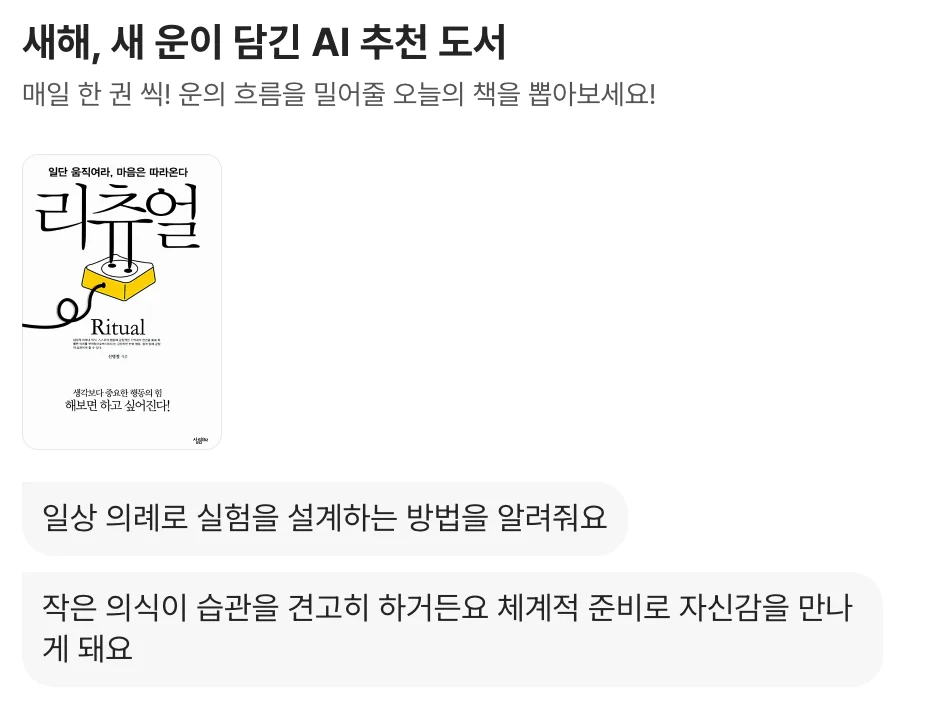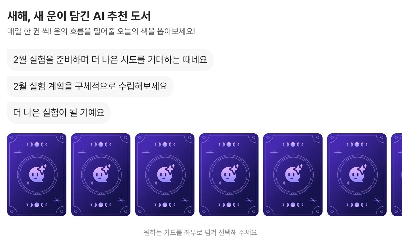 AI발견 메뉴에 들어가시면 마치 타로카드를 뽑는것 같은 UI로 새해, 새 운이 담긴 AI 추천 도서를 뽑을 수 있습니다.