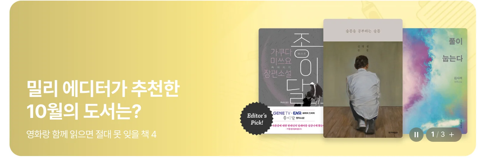 특히, 밀리의서재에디터 큐레이션 맛집인데요 😋 계절이나 시의성에 맞는 책들을 그때그때 묶어서 소개해주니 월 구독료가 아깝지 않은 선택이 될 수 있을 것 같아요.