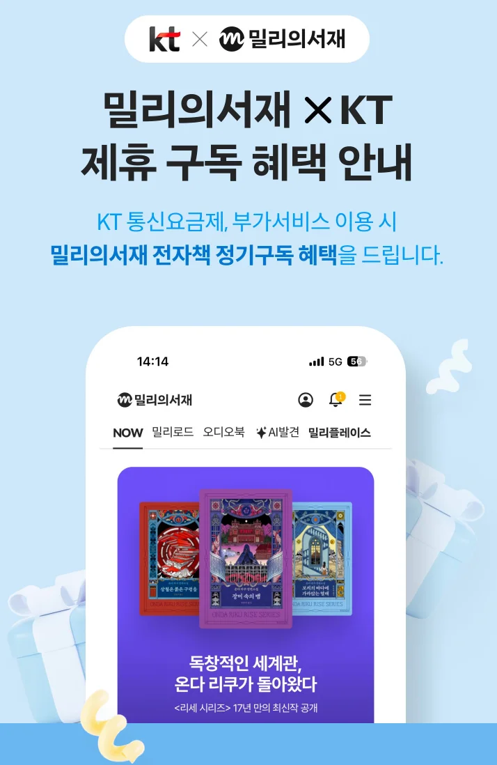 KT 통신사 제휴의 경우 밀리의서재를 계열사로 가지고 있기에 모든 고객을 대상으로 월 9,900원에 제공하고 있어요.