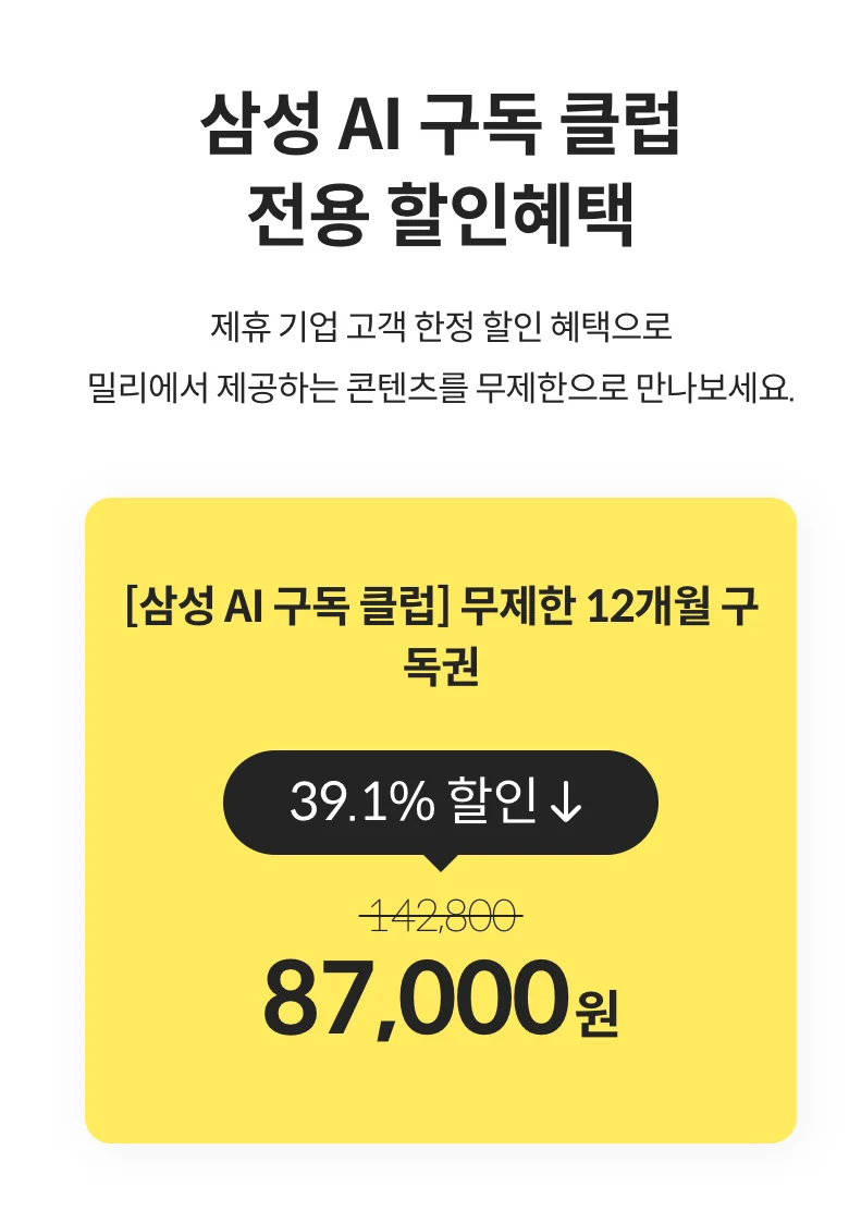 밀리의서재삼성 AI 구독 클럽이 만나 새로운 할인 혜택을 제공하는데요. 무제한 12개월 구독권이 87,000원입니다. 월 단위로 환산하면 7,250원이에요.