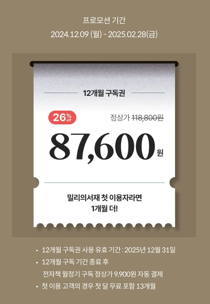 에디터가 올해 초에 사용했던 방법인데요. 밀리의서재는 연말과 연초에 할인 프로모션을 진행하는 경우가 많아요.