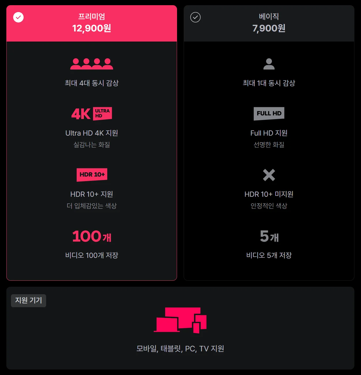 베이직은 월 7,900원, 프리미엄은 월 12,900원이랍니다. OTT 중 가장 저렴한 가격이에요.