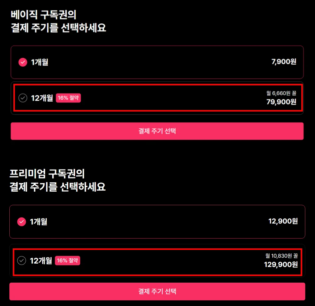 베이직 요금제는 1년 구독 시 79,900원, 프리미엄은 129,900원으로, 1개월 요금으로 12개월 구독했을 때보다 월 16% 할인된 가격으로 이용할 수 있어요.