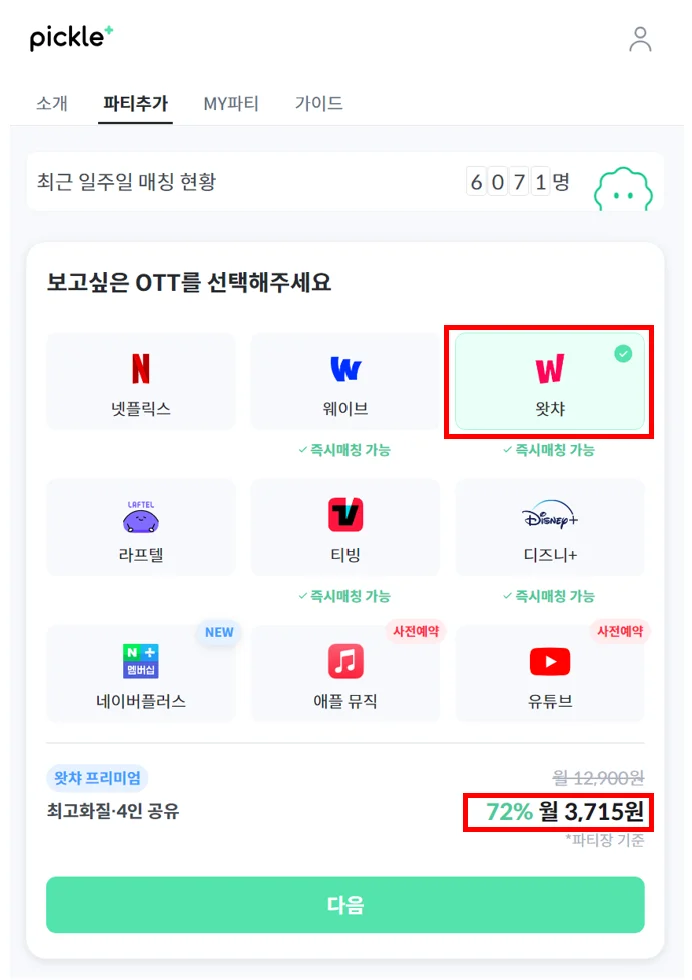 피클플러스에 파티장으로 가입한 뒤, 왓챠 1년 이용권 계정을 공유한다.
