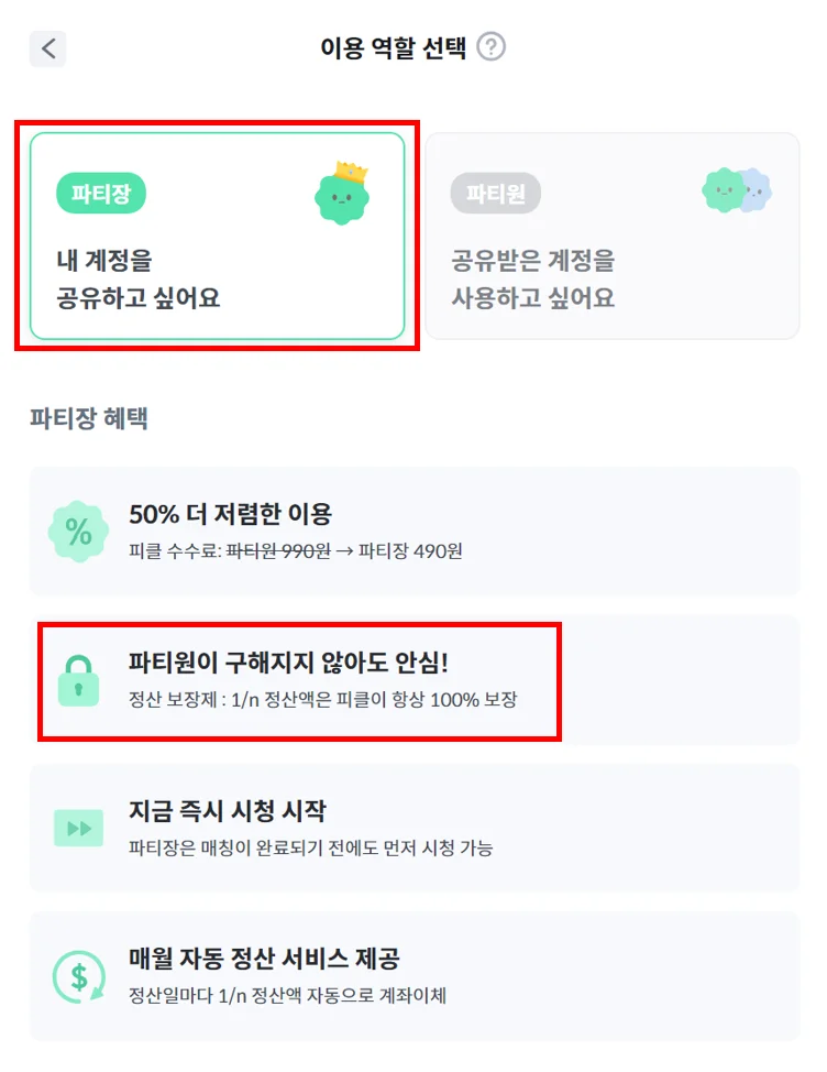 다른 계정 공유 서비스에서는 파티원이 구해지지 않는다면 월 비용을 고스란히 혼자 내야 할 수도 있으니까요.