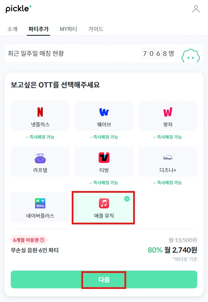 파티장은 파티원을 초대해야 하는 번거로움이 있지만, 피클플러스 이용 수수료가 반값으로 할인되고(990원→ 490원), 자신의 계정이기 때문에 파티원이 전부 매칭되기 전에도 애플뮤직을 바로 이용할 수 있다는 장점이 있어요.