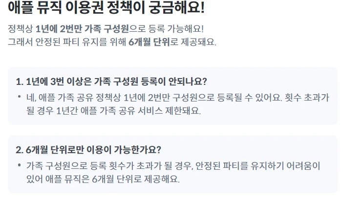 가족 구성원 등록 횟수가 초과되면 1년간 애플뮤직 파티원으로 추가될 수 없어서 안정된 파티 운영을 위해 피클플러스는 6개월 단위로 애플뮤직 파티를 제공하고 있어요.