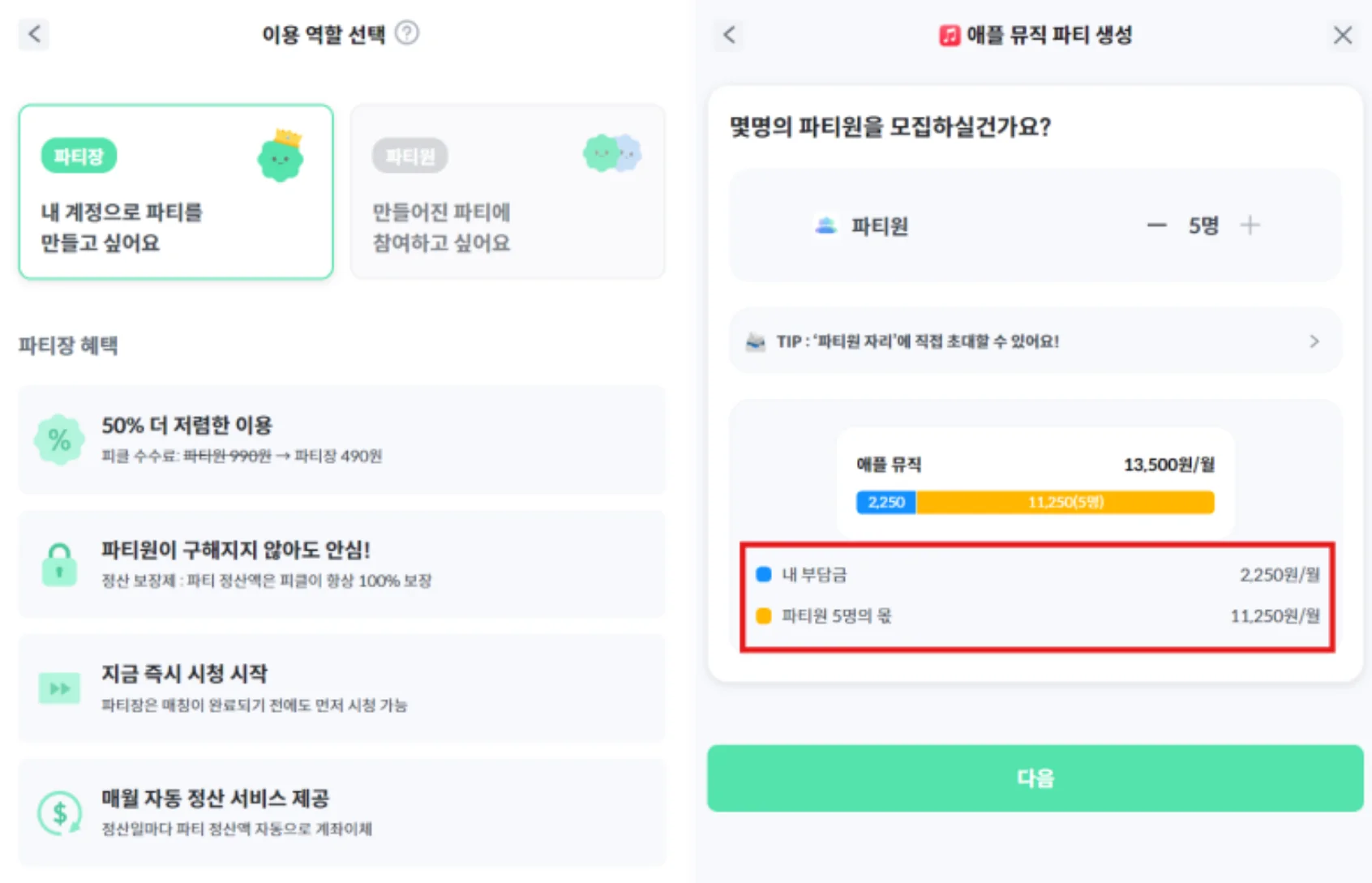 월 2,250원에 애플뮤직 할인 최대로 받고 싶다면 ‘5명’ 모집으로 진행하면 돼요.