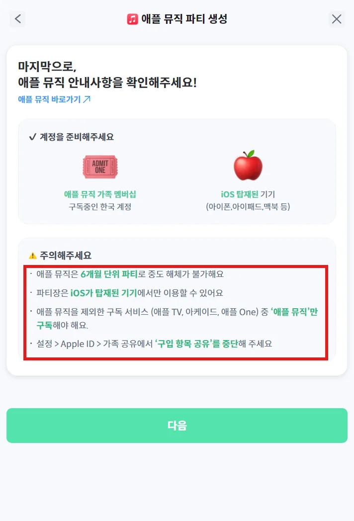 마지막으로, 애플뮤직 파티장 유의사항을 확인해주세요!