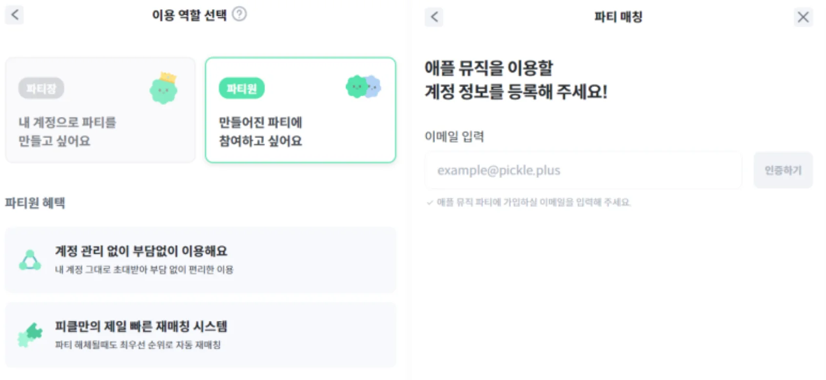 피클플러스는 자동 파티 매칭 기능이 있어서 파티장/파티원 역할만 선택하면 대기하고 있는 파티원과 생성된 파티끼리 자동으로 매칭이 되어 빠르게 애플뮤직 시작할 수 있는데요, 지금부터 피클플러스에서 애플뮤직 파티 만드는 방법을 알려 드릴게요!