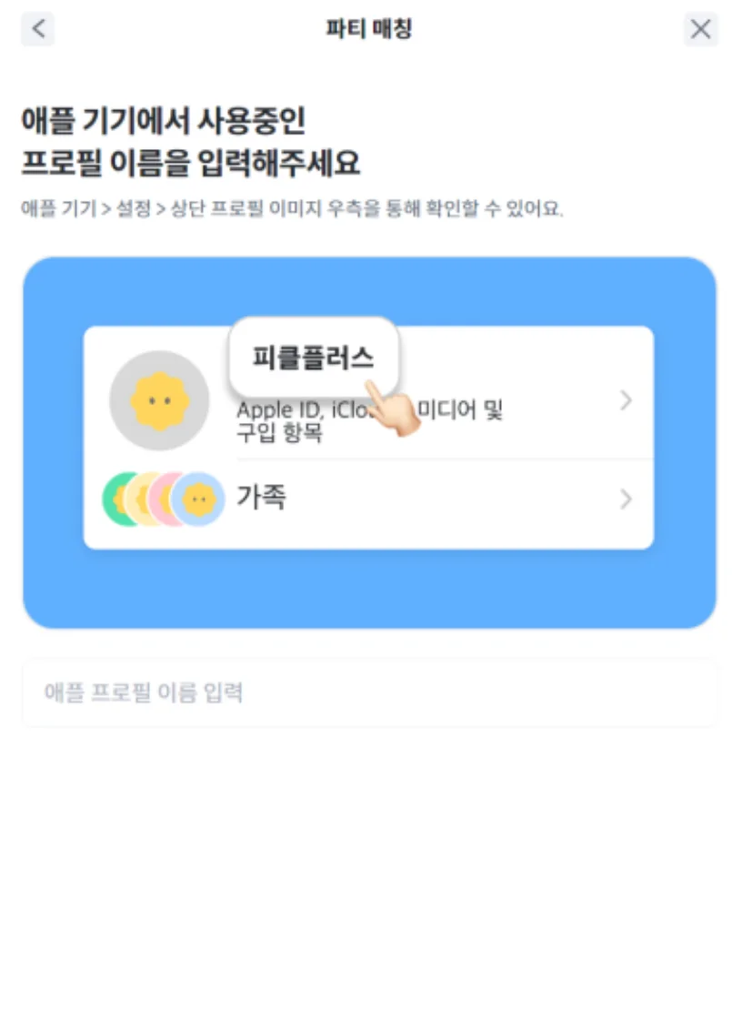 파티 생성이 완료됐어요! 이제 피클플러스 안내에 따라 매칭된 파티원을 iOS 설정에서 ‘가족구성원’으로 초대하면 돼요.