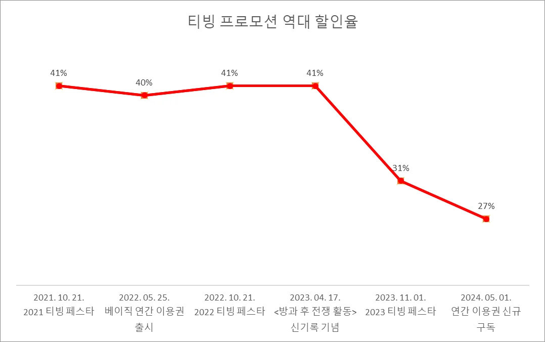최근 할인율은 소폭 감소했지만, 대체로 높은 할인율을 기대할 수 있기 때문에 티빙을 싸게 이용하고 싶다면, 티빙 페스타 기간을 노려 보는 것을 추천해요.