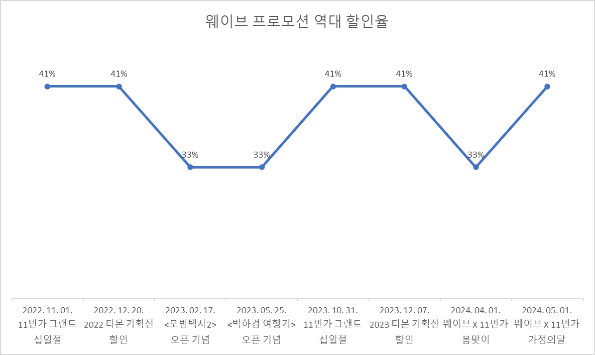 역대급 (41%): 웨이브 x 11번가 2022/2023 그랜드십일절 & 2024 가정의달 특가 판매, 웨이브 x 티몬 2022/2023 기획전 할인 판매