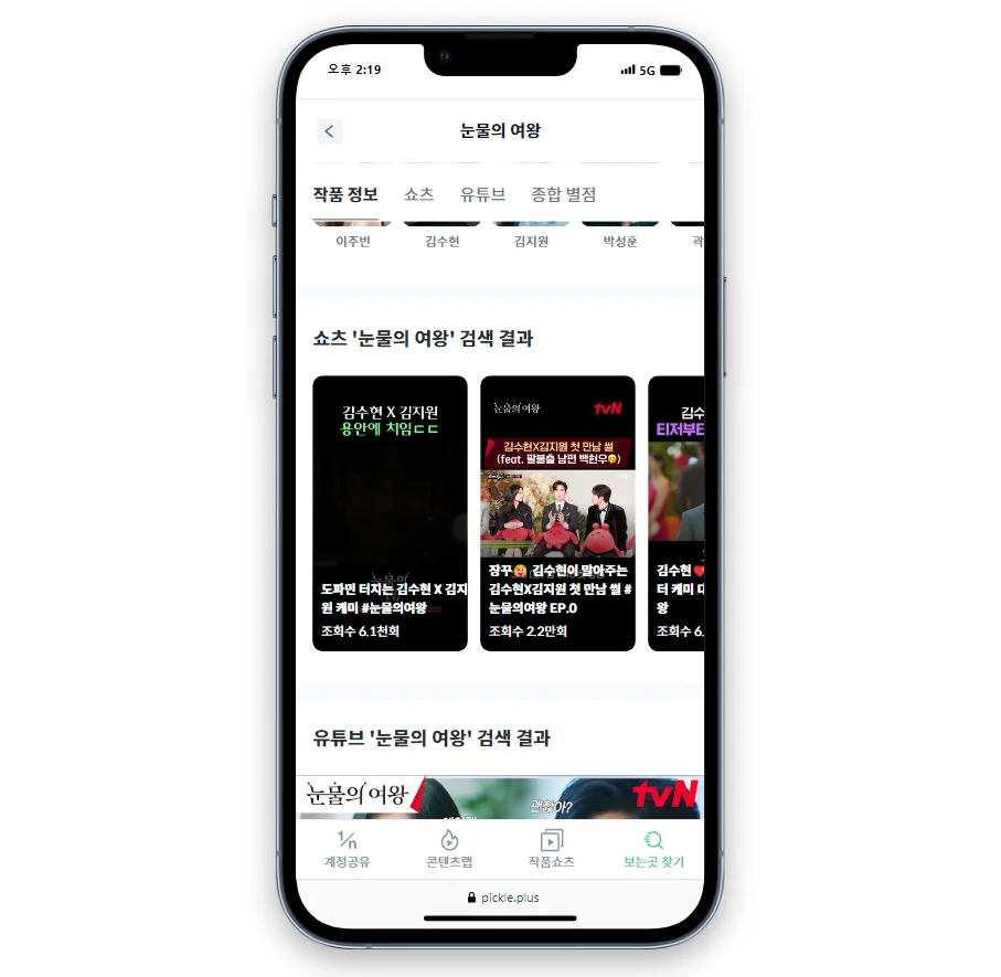 피클플러스 | ⭕ (구독형 OTT) | 네이버, 다음, 쿠팡플레이 | · 유튜브 및 쇼츠 검색 결과 제공 |