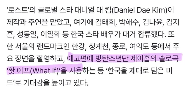 할리우드에서 활약 중인 다니엘 대 킴 주연. 김태희, 성동일, 박해수 등도 출연합니다. 아마존 프라임 비디오에서 지난주부터 공개됐고, 티빙에는 8월 22일부터 공개. 탑 크리틱들만 옮겨봤습니다. 녹색은 썩은 토마토. 아라미드 티누부 – Variety 이 시리즈는 흥미로운 스릴러가 되기 위한 모든 요소들을 갖췄지만, 견실한 캐릭터 중심의 드라마라기보다는 속임수에 가깝다.