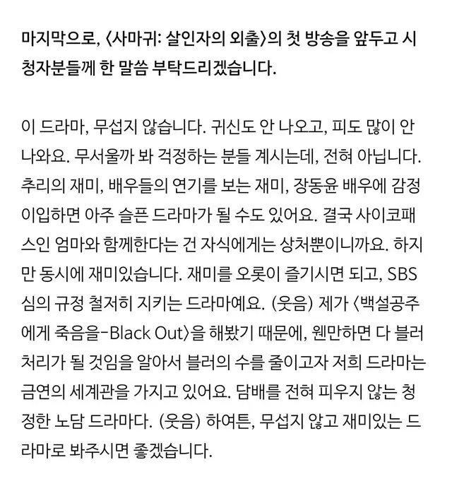 SBS 심의 규정 철저히 지키는 드라마예요. 웬만하면 다 블러 처리가 될 것임을 알아서 블러의 수를 줄이고자 저희 드라마는 금연의 세계관을 가지고 있어요. 담배를 전혀 피우지 않는 청정한 노담 드라마다. 하여튼, 무섭지 않고 재미있는 드라마로 봐주시면 좋겠습니다. ㅋㅋㅋㅋㅋㅋㅋㅋㅋ #사마귀